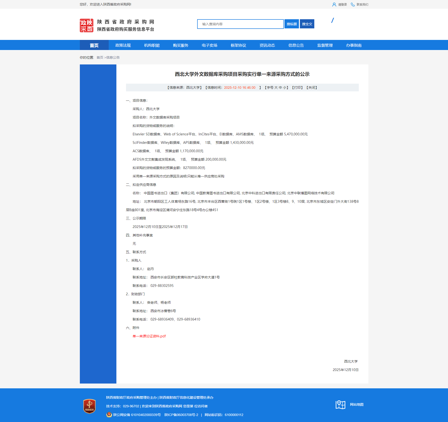 伟德国际1946源于英国外文数据库采购项目采购实行单一来源采购方式的公示