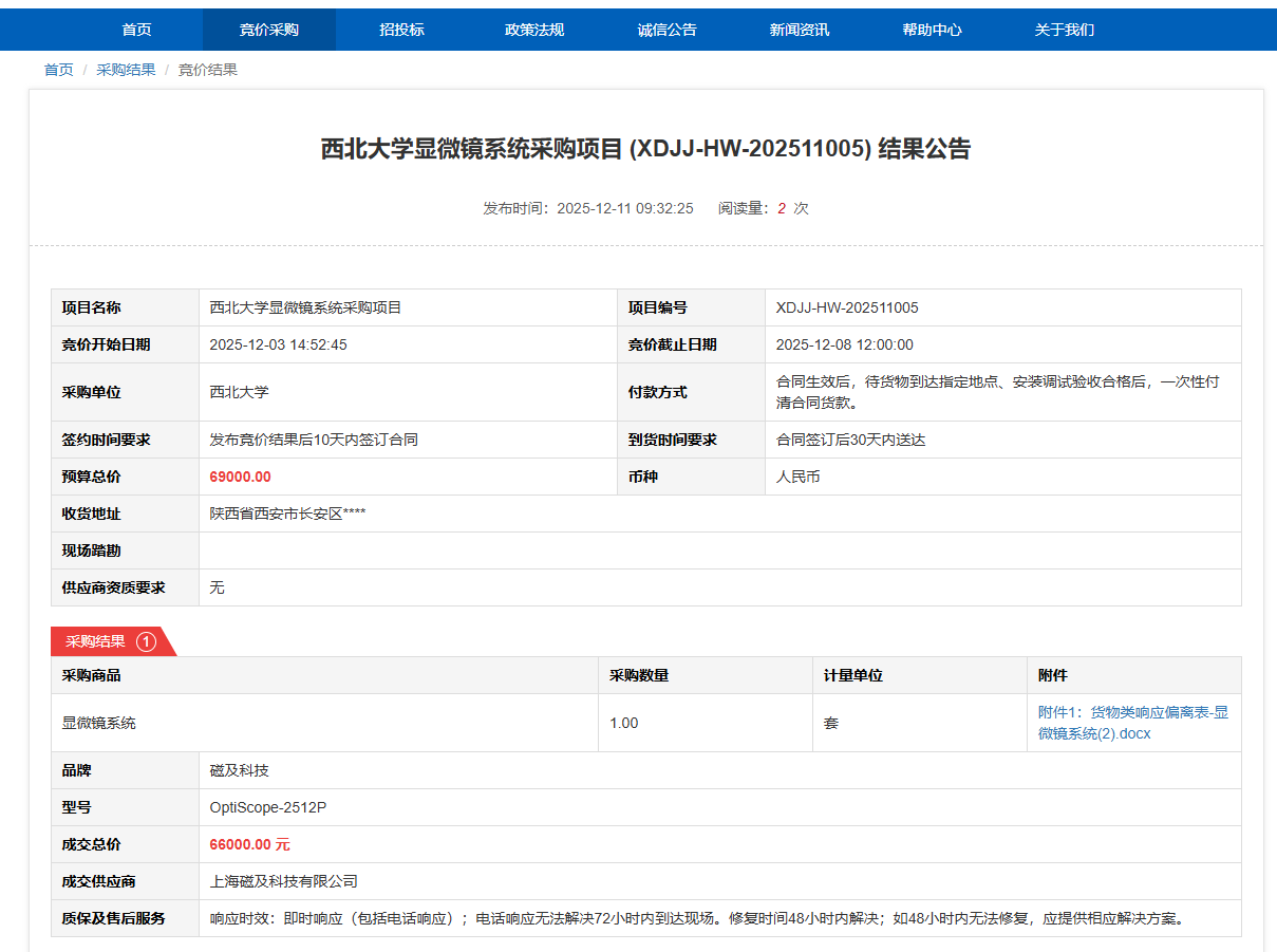 伟德国际1946源于英国显微镜系统采购项目(XDJJ-HW-202511005)竞价结果公告