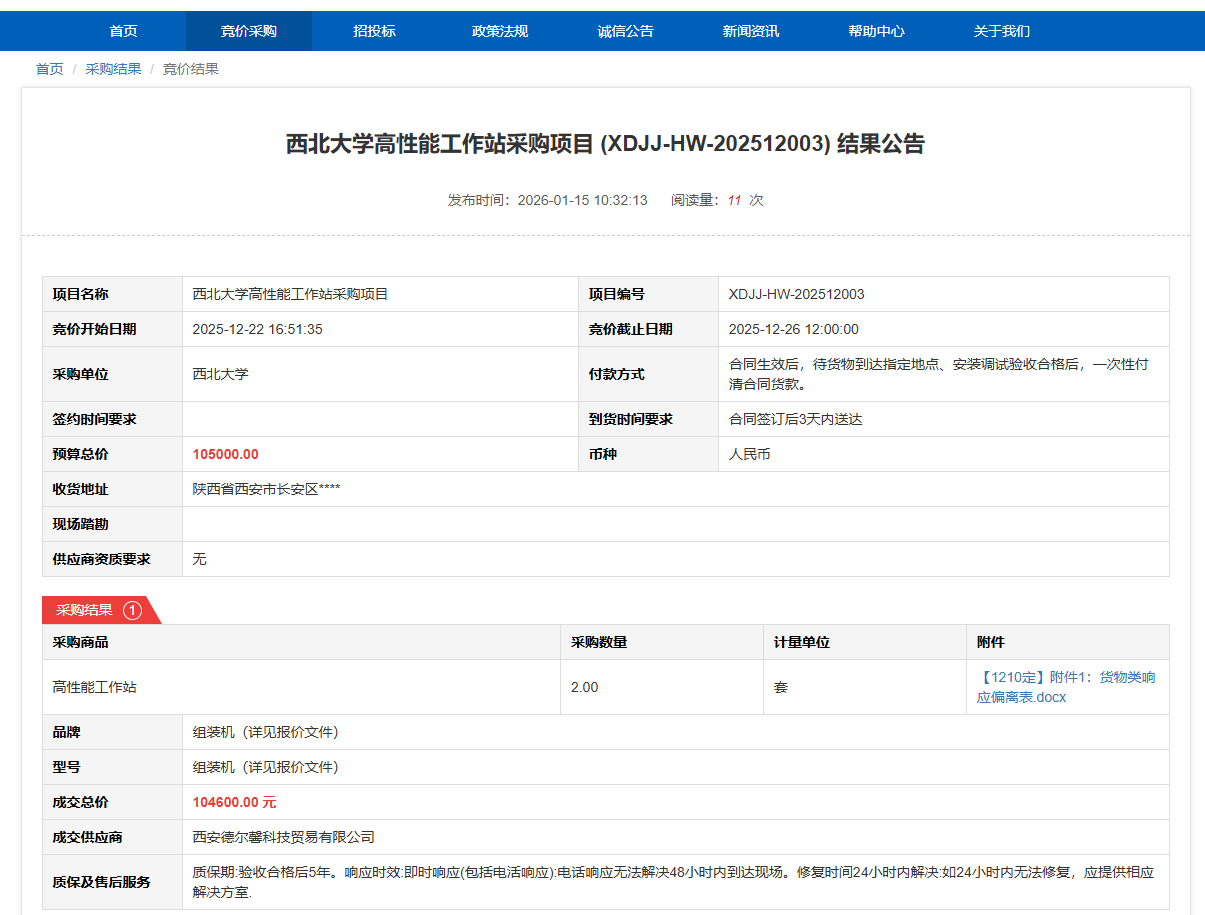 伟德国际1946源于英国高性能工作站采购项目(XDJJ-HW-202512003)竞价结果公告